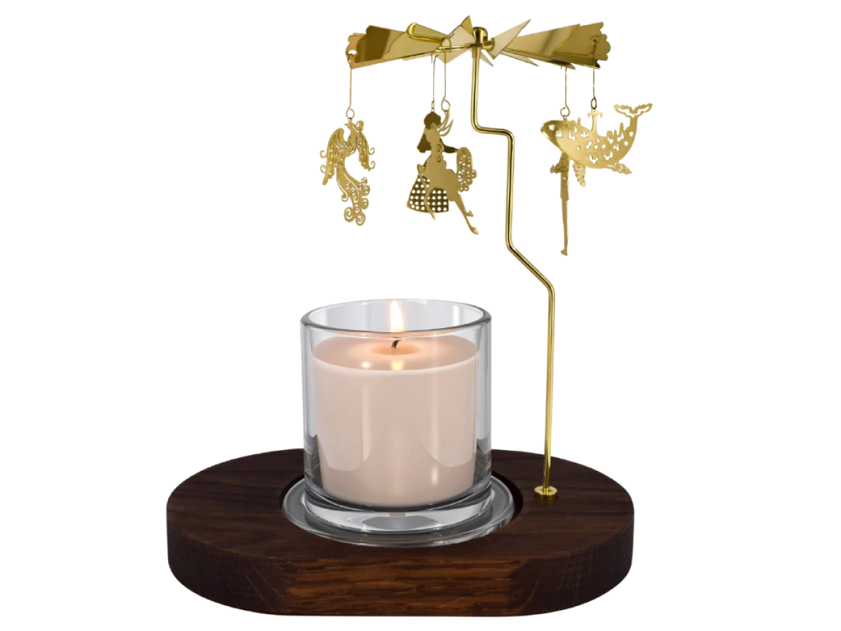 Подсвечник выполнен в виде карусели по мотивам сказки «Конёк-горбунок» с героями произведения. Изделие изготовлено из латуни, декоративные элементы выполнены с применением лазерной резки и ювелирной обработки. Поверхность покрыта защитным лаком, сохраняющим внешний вид и предотвращающим окисление. Постамент изготовлен из тонированного дуба, что придаёт композиции завершённость и устойчивость.